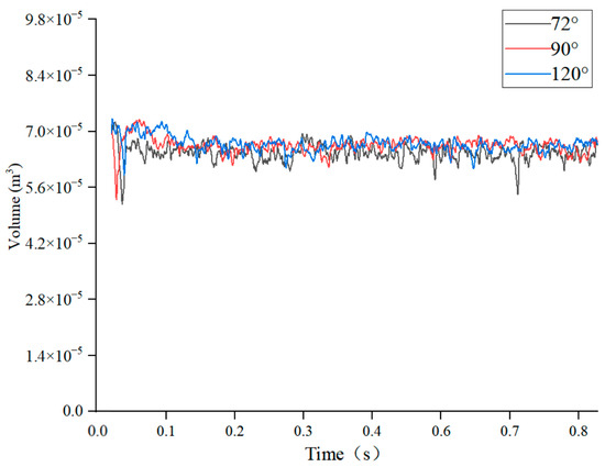 The volume of the gas phase in the valve is also an important parameter to reflect the severity of cavitation in the valve. Using this volume, the cavitation characteristics of the valve under different spool structures are analyzed. Figure 20 shows the change in the volume of the gas phase in valves with spool angles of 72°, 90°, and 120° with time. The volume of the gas phase of the valve peaks for a very short period of time and then fluctuates within a certain range; it also changes very little with the change in spool structure, and this change is negligible.