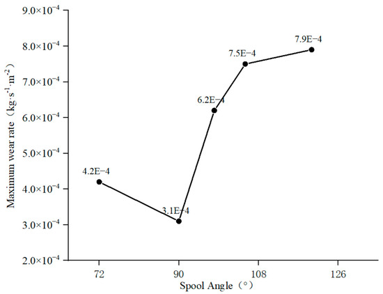 Figure 22 shows the maximum wear rate inside the valve under different spool angles. The calculation results show that when the spool angle is 72° and 90°, the maximum wear rate inside the valve is 3.4 × 10−4 kg·s1·m−2 and 3.1 × 10−4 kg·s1·m−2, respectively. When the spool angle is greater than 98°, the maximum wear rate is 3.4 × 10−4 kg·s1·m−2. At this time, the maximum wear rate in the valve increases by 5.3 × 10−4 kg·s1·m−2, and continues to increase with the increase in the spool angle.
