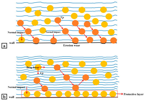 Based on the above analysis of the maximum wear rate in the valve and the wear rate at different locations of the two wall surfaces of the valve core, it can be concluded that the wear on the inclined wall of the valve is more severe than that on the transverse wall. When the valve core angle is 90°, the valve will suffer the lowest particle erosion wear damage; the greater the valve core angle is over 90°, the more severe the valve erosion wear will be. The influence of the particle residence time at the valve core wall on wall wear is preliminarily analyzed. Two hypotheses are proposed: the longer the particles stay at the wall of the valve core, the stronger the direct erosion and wear effect will be, as shown in Figure 24a, and the other is that when the particles stay on the wall of the valve core for a certain amount of time, they will form a protective film on the wall, in which case collisions between particles will increase and the direct effect of particles on the wall will decrease, as shown in Figure 24b.