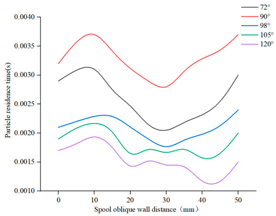 Figure 25 shows the residence time of particles at different parts of the inclined wall of the valve core under different spool structure conditions. It can be seen that when the spool angle is 90°, the particle residence time at the spool wall is the longest, followed by that at 72°, 98°, and 105°. When the spool angle is 120°, the residence time at the spool wall is the shortest. It can be concluded from these results that when the valve core structure changes, both the particle residence time and the wear effect on the valve core wall will also change. Moreover, the longer the particles stay at the valve core wall, the lower the particle wear effect on the valve will be, which is consistent with the diagram in Figure 23b.