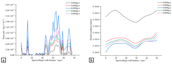 Spool wall wear rate and particle residence time under different particle mass flow conditions ((a) spool wear rate, (b) particle residence time).