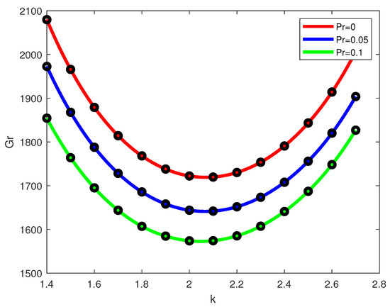 where G and H are complex-valued nonsingular matrices and . Problem (50) was solved iteratively many times using the Matlab solver eig to find the values of the parameters k and such that one eigenvalue has a zero real part while the other eigenvalues have positive real parts. The corresponding pair is the point on the marginal stability curve. The procedure was repeated for different values of k and to generate the marginal stability curves shown in Figure 2. In addition, the eigenfunction of the linear stability problem was also calculated for the set of parameters .