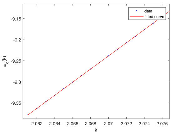 The calculated critical values of the parameters k, , and c for the case are, respectively, , , and . The group velocity is found from (40): . The calculated values of the coefficients of the Ginzburg–Landau Equation (48) are , , .