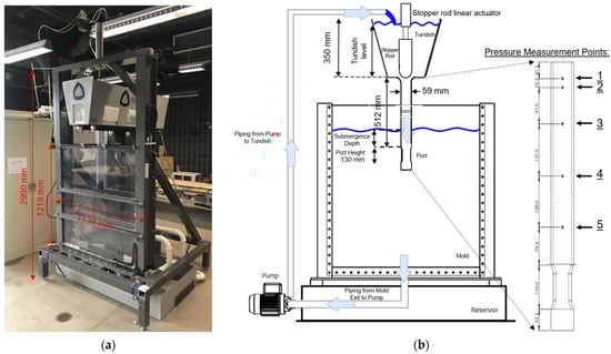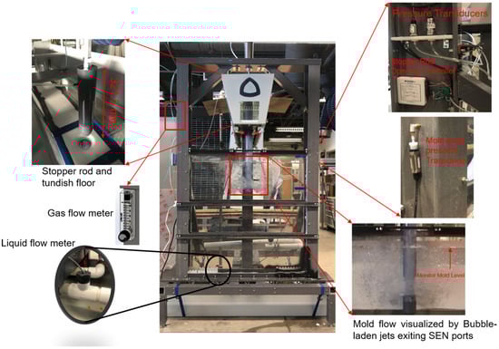A 0.6-scale water model of a typical continuous caster of steel slabs was constructed at the Colorado School of Mines (Golden, CO, USA) from 2017 through 2020 [71]. As shown in Figure 1 and Figure 2, this physical model is equipped with a tundish, a stopper-rod with a linear actuator and an air injection system, an SEN, mold, a water overflow reservoir, a piping system with a paddlewheel-type water flow meter, and a centrifugal pump, as well as pressure diaphragm transducers to monitor the liquid level in the mold and to measure pressure at different points inside the SEN.