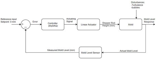 The classic feedback control system of the water model is shown in Figure 4. Its goal was to adjust the linear actuator position to alter the stopper-rod position (vertical opening) and corresponding water flow rate to maintain a constant liquid level in the mold. Error input to the controller is defined by the difference between the user-desired mold level and the height measured by the sensor defines. The linear actuator then adjusts the vertical position of the stopper-rod, which affects the water flow rate into the mold, and, therefore, the level of the liquid surface. This system aims to maintain a steady state mold level to allow the operators to focus on gathering data [71].