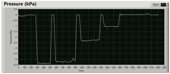 Figure 5 illustrates the CSM water model GUI, showing an example of the recorded pressure for a test with steady-state flow conditions. The tube connected to the pressure sensor is moved between sensing ports during each test to record the pressure at all five locations down the SEN shown in Figure 5. This enables data acquisition at all positions with only one sensor, as shown in Figure 2. The sensor data are collected using a DAQ card that displays the graph and saves it to an Excel file through LabVIEW 2019 [71].