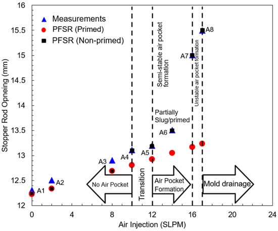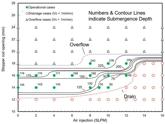 Figure 6 shows the flow stability results of many tests conducted at different stopper-rod openings and air injection rates for other conditions given in Table 1, including constant tundish level and constant pump flow rate for a casting speed of 1 m/min. Results are presented in a grid to map stable operating conditions (cases with green circles and numbers indicating mold liquid level) relative to cases with insufficient flows (red circles) and cases with excessive flows (black triangles). For cases with stopper-rod openings above 20 mm, the liquid level continuously increases, even at smaller air injections, until the water model overflows. This indicates stable casting greater than 1m/min. For cases with stopper-rod openings of 12 mm or less, the liquid level continuously drops until the mold cavity completely drains, regardless of the air injection rate. This indicates that the stable casting speed is less than 1 m/min for these cases. In between, there is an operating window, where the stopper-rod opening can be adjusted (increased between 13 and 18 mm) to compensate for the extra flow resistance caused by the gas injection to enable stable flow without either drainage or overflow.