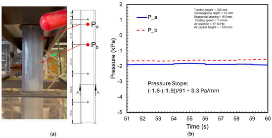 Figure 7 shows pressures measured inside a region below the stopper that contained a large fraction of air. Specifically, the increasing pressure slope from points a to b is ~3.3 Pa/mm. This is much smaller than the hydrostatic pressure increase of ~10 Pa/mm found in the bubbly flow regime of the nozzle. The results here are consistent with previous modeling studies that state that pressure inside an air pocket should be constant [52]. This is because the pressure can equilibrate in a region where the gas phase is continuous. These new results suggest it is rare to obtain a “perfect” gas pocket with fully continuous gas and zero pressure drop. However, these new results confirm the presence of flow regimes with very large gas fractions, which sustain very small pressure drops.