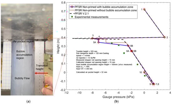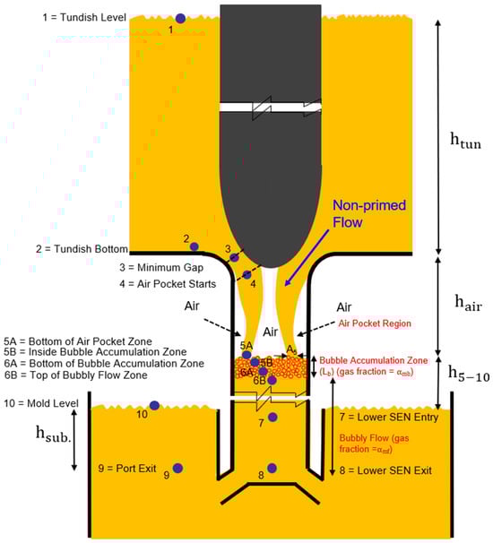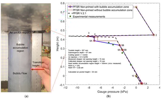 To better understand the results of the water model studies, a computational model was applied to simulate pressure and flow in each experimental case, using a simple but accurate approach validated in previous work [52]. An improved version of the previous PFSR model of pressure and flow rate in stopper-rod continuous-casting systems [52], PFSR V.4.0, is introduced here. Specifically, this version improves PFSR V.3.0 [52] by including a possible gas accumulation region between regions of gas pockets and bubbly flow. PFSR V.4.0 is applied here only to the CSM water model, so, unlike in commercial steel casters, where cavitation was often predicted [52], there is no cavitation for the conditions in this paper.