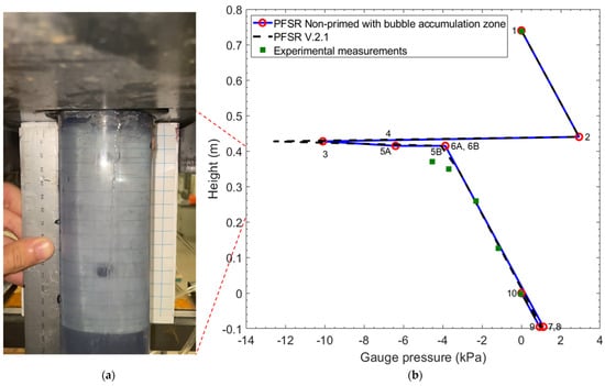 where is the liquid density [kg/m3]; is the local gas fraction inside the entire bubble accumulation zone, (5A to 6B), which must be given as input; is the local gas fraction in the bubbly flow zone; and is the length (height difference) between points i and i + 1 z. Note that points 6A and 6B are at the same height but are at the boundary between two adjacent zones (bubble accumulation to bubbly flow). Further details on these equations are discussed elsewhere [51,52].
