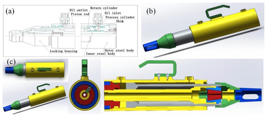 Construction of the front hydraulic jack. (a) Two-dimensional schematic diagram; (b) three-dimensional outline diagram; (c) simplified three-dimensional cross-section diagram.