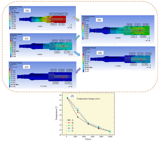 The boundary conditions of the simulation are set, and the steady-state temperature analysis is used to make the overall temperature reach the highest state. The oil temperature and the surrounding temperature reach 60 °C. Then, the transient analysis is carried out. The simulation results of the transient temperature field coupled with heat flow at different times are shown in Figure 5. The analysis time is extended to analyze the general temperature distribution and record the temperature of the five points, as shown in Figure 5f. The five curves represent the temperature changes in the five temperature sensors in the working process of the jack to capture the temperature dynamics in different areas. Specifically, the position of the sensor is arranged according to the distance from the oil inlet, in the order of A, D, B, E, C. These five points are located in different parts of the jack, including the inlet and outlet ports, the interior of the cylinder, the piston, and the base. The main reason for choosing these five points is that their location, temperature, flow rate, and direction are the most representative. By recording and analyzing the temperature data of these points, the thermal performance of the jack at different working stages can be more accurately evaluated.