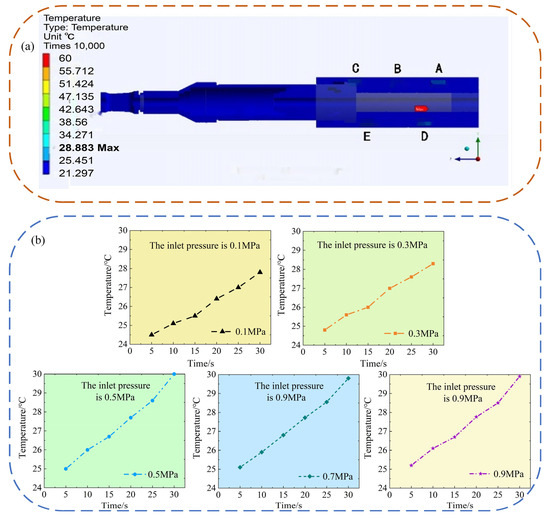 The outlet pressure of the front hydraulic jack is set to 0 MPa; that is, the ambient pressure, the temperature of the piston and hydraulic cylinder, is set to room temperature (24 °C), and the inlet pressure is set to 0.1 MPa, 0.3 MPa, 0.5 MPa, 0.7 MPa and 0.9 MPa, respectively. The temperature field distribution cloud diagram in the jack under 0.1 MPa inlet pressure conditions is shown in Figure 6a. The simulation results of the average temperature change in the five key points over time are shown in Figure 6b.