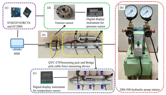 Test piece and test platform of dual-mode self-calibration tensioning system. (a) Test platform; (b) high-pressure oil pump; (c) installation position of the temperature sensor; (d) tension sensor; (e) controller and wireless transmission module.