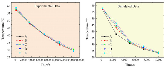 To verify these parameters through the finite element analysis results, the temperature field of the jack is tested. In the experiment, the temperature values of the inlet, outlet, piston, and outer surface of the jack are measured, and compared with the simulation results. Test conditions: start the electric heater to heat the stainless steel tube fully, and collect the temperature data when it reaches 60 °C. The sampling frequency of the data acquisition card is 1 KHz. Hydraulic oil heating uses a resistance wire heating rod directly in the oil heating because a resistance wire will produce a high-temperature phenomenon, that will damage the hydraulic oil’s body structure; so, continued stirring heating in the oil is necessary. It is thought that the jack contacts hydraulic oil in the simulation of the surface for constant temperature boundary conditions, as well as for convective heat transfer boundary surface; a jack transient temperature field simulation analysis is carried out with working conditions of a hydraulic oil temperature of 60 °C condition; the temperature change curve of the jack to reach the thermal equilibrium state after the process of each measuring point is shown in Figure 8.