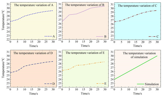 According to the numerical simulation results above, after the inlet pressure reaches 0.5 MPa, the piston movement speed reaches the maximum and remains unchanged (combined with Table 3); so, the temperature change curve is almost the same. Therefore, in the test, the inlet pressure of the clamping hydraulic jack before setting is 0.5 MPa. The five distributed temperature sensors detect the operating temperature changes in each key measurement point, as shown in Figure 9.