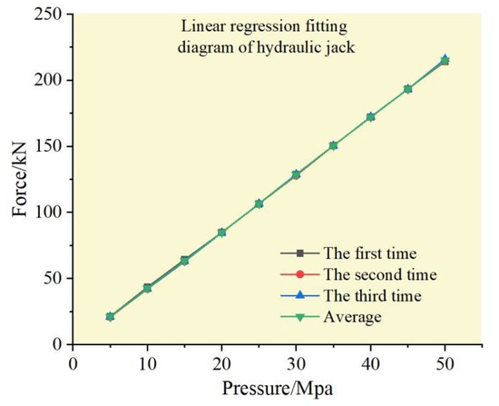 where is pressure gauge value, and is the standard force value. Ten calibration points from 10% (5 MPa) of the rated force value of the hydraulic jack are selected and calibrated point by point in increasing order. Based on the reading of the indicator pressure gauge, the reading of the standard force gauge is read, the test is repeated three times, and the data are recorded. The hydraulic jack test data are shown in Table 10.