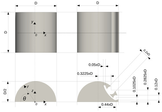 The turbulent flow is characterized by the following Reynolds and Mach numbers: 130,000, , respectively. Here, is the density, U is the far-field velocity, a is the speed of sound, represents the dynamic molecular viscosity, and D is the diameter of the thick airfoil (semi-circular cylinder). The subscript ∞ indicates the flow parameters at the inlet boundary.