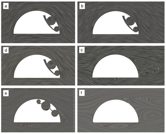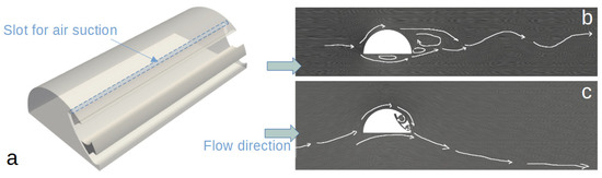 The physics and topology of the flow over BB without trapped vortex cells are qualitatively similar to the flow over a semi-circular cylinder at 50,000, as discussed in detail previously [22]. At a Reynolds number of 130,000, the separation of the laminar boundary layers occurs in the sub-critical flow regime. This condition results in complex, nonlinear interactions between near and far wakes characterized by two types of flow instabilities (Figure 2b). The Kelvin–Helmholtz instability of the separated shear layer, along with vortex shedding (Bénard/von Kármán instability), dominates the wake. Figure 2c shows the schematic flow over the BB with integrated vortex cells. Unlike the initial study [13], this design completely rearranges the flow over the airfoil, making it predominantly unseparated.