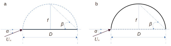 Figure 3. Geometrical parameters of an idealized airfoil: a flat-plate (a) and half-circle (b). - —flow around a curved plate in the form of a half-circle (see Figure 3b). In this case, the following values of can be obtained:One can see clearly that the maximum lift coefficient can be achieved for . Of course, the value of depends on the length used as a reference. Here, it is assumed that the conventional chord is applied. For a circle, under the imposed assumptions, it is possible to recover as a limit. In the same spirit, the half-circle limit of can be considered. That is the limiting value for any single-element airfoil [30].