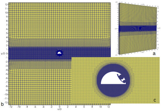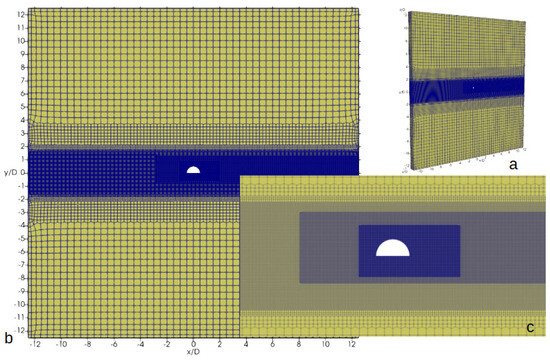 General view of the baseline mesh and computational domain (a,b) and its frontal view and zoom in the vicinity of a semi-circular cylinder (c).