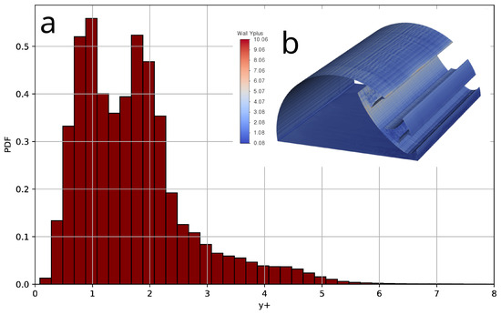 The unstructured, hexahedral-dominated grid used to simulate the flow over the BB with the implemented aerodynamic flow control was designed similarly to the grid for the semi-circular cylinder (referred to as A0 and presented in Figure 5). The computational domain was defined as a rectangular block with dimensions , initially seeded with nodes in the x, y, and z directions, respectively. The region from to was refined with a coefficient of at the next level. The block from to was further refined using a uniform cell size of . Finally, the cylindrical region with a radius of , located at the center of the Cartesian coordinates, was meshed with a uniform cell size of . A viscous sub-grid was added to the obstacle with averaged , an expansion factor of , and a total of five layers. The total grid size amounted to cells. For the second grid (referred to as A1), the cylindrical region with a radius of was re-meshed with uniform cell sizes of , resulting in a total of cells. Figure 6 displays the probability distribution function (PDF) of and its visualization at the surface of the airfoil for the A1 mesh.
