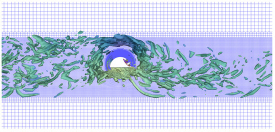 The main results are presented in Table 1 and Figure 7, Figure 8, Figure 9, Figure 10 and Figure 11. Figure 7 shows the visualization of the instantaneous velocity field using the Q-criterion, clearly depicting the turbulent flow over the object with implemented AFC. Figure 8a,b displays the time-averaged flow field using the LIC (Line Integral Convolution) technique, demonstrating completely non-separated flow over the concept. Figure 9 shows the mean values of the streamwise velocity () and its fluctuations () along the central axial section. For comparison, the values of and obtained for the flow past a circular cylinder for 130,000 ([23]), a semi-circular cylinder for 50,000 ([22]), as well as the available experimental data are gathered. The practically unperturbed flow field over the new concept with AFC predicted numerically is clearly visible. Figure 10 shows the one-dimensional energy spectra of the velocity magnitude obtained at the centers of vortex cells and in the near wake. The spectra obtained on grids A0 and A1 are practically identical, agree well with the universal power law of , and also show the absence of any characteristic low-frequency oscillations associated with vortex dynamics, both in the near wake and in the trapped vortex cells.