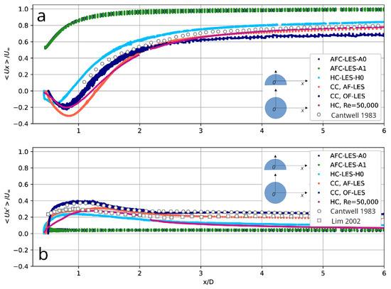 Distribution of the mean streamwise velocity (a) and its RMS values (b) along the central axis for the flow over a bluff body with and without AFC at 130,000. Supplementary data are provided for HC at 50,000 [22] and CC at 130,000 [23], respectively. Experimental data are included from Cantwell and Coles [44] and Lim and Lee [45].