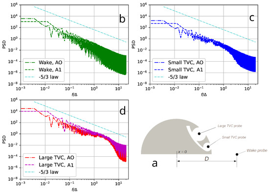 One-dimensional energy spectra of the velocity magnitude computed for an obstacle with AFC at 130,000: general scheme (a) of the measurement probe locations in the near wake (b) and in the centers of the trapped vortex cells (c,d).