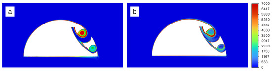 It is noteworthy that the aerodynamic drag of the proposed design increased by about compared to a conventional thick airfoil (semi-circular cylinder). This increase is likely due to the consistent pressure drop set in all simulations for air suction from the vortex cells. Additionally, the pressure drop value was slightly increased to ensure the stability of the numerical simulations. The study of the pressure drop’s influence on the aerodynamic characteristics of the object remained beyond the scope of this work but is a fundamental topic for further optimization.
