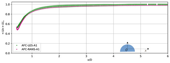 Distribution of the streamwise velocity along the central axis for the flow over a bluff body with AFC computed by LES and RANS at 130,000.