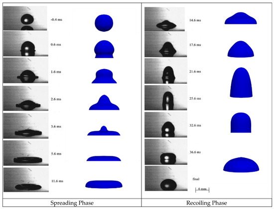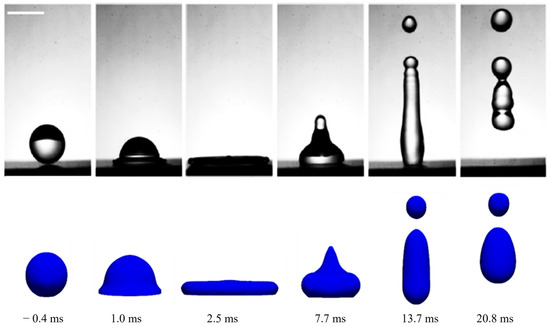Comparison of experimental and numerical results for a water droplet impinging on a polycarbonate surface. Experimental results are shown in black-and-white images [28], while the numerical results are blue, representing the evolution of the water droplet shape. Experimental results are reproduced with permission from [28]. Copyright 2001 AIP Publishing LLC.