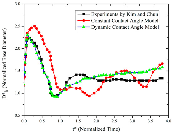 The normalized base is plotted against the normalized time to further elucidate the dynamics. This plot provides insights into the orders of magnitude changes in the spreading diameter over time, highlighting the intricate interplay between inertial, viscous, and surface tension forces during the droplet’s impact and subsequent evolution. Figure 4 below shows the variation in the normalized base with normalized time for constant and dynamic contact angle models for comparison with the experimental results reported by Kim and Chun [28].