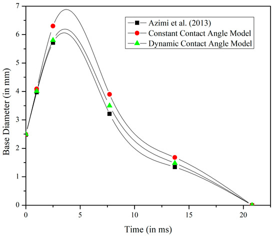 Based on the experimental data reported by Azimi et al. [29], the base diameter of the droplet increases post-impact, reaching a maximum of 5.71 mm at 2.48 ms before decreasing as the droplet bounces off the surface at 20.8 ms. The experiments did not document or report the subsequent rebound and oscillatory behavior stages. However, the computational model replicates the observed trend, with the dynamic contact angle model providing more accurate results than the constant contact angle model. The constant contact angle model tends to overpredict the base diameter. In contrast, the dynamic contact angle model offers better predictions due to its more sophisticated approximation of the contact line velocity at the solid–liquid interface.
