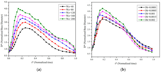 The Ohnesorge number (Oh) is used to predict the nature of the recoiling phase and analyze the spreading and recoiling behavior of droplet impingement on a solid surface. The Ohnesorge number (Oh) is defined as the ratio of viscous forces to inertial and surface tension forces, and the Ohnesorge number quantifies the relative importance of these forces for a given inertia. Figure 8b compares the base diameter evolution for different Ohnesorge numbers, with all cases having the same inertia, to distinctly compare the effects of viscous and surface tension forces.