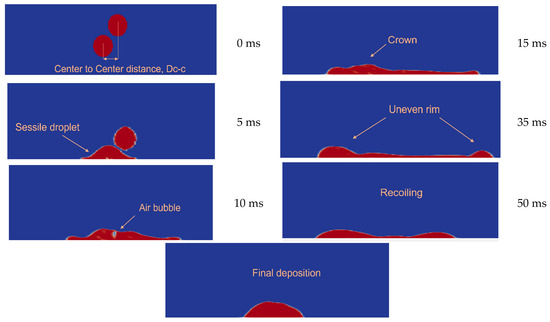The coalescence mechanism, which encompasses rupture, deformation, and interface merging of droplets, warrants further investigation within the context of droplet-based printing. Extensive studies have been conducted on the dynamics of coalescence, focusing on droplet–droplet interactions [30,31,32], interactions with solid surfaces [33,34,35,36], and interactions with liquid films [32,35,37,38]. Various computational approaches have been employed to capture the interfaces during coalescence, including the solution of Navier–Stokes equations and computational fluid dynamics (CFDs) techniques [39,40,41], the lattice Boltzmann method, and molecular dynamics (MDs) simulations [42,43,44,45].