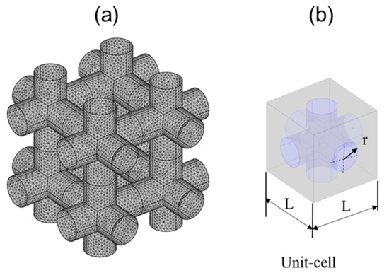 where is the fluid velocity, is the pressure gradient, is the density and is the dynamic viscosity. The porous medium is formed by a group of cylinders (beams) structured in a simple cubic (SC) lattice, as shown in Figure 1a. A fluid flows through the interconnected voids. To construct a microscopic model, we define a unit cell, illustrated in Figure 1b, and assume that the whole porous medium is simply multiple copies of this unit cell, geometrically and physically. The characteristic scales of this unit cell are the distance between two cylinders, L, and the radius of the cylinder, r.