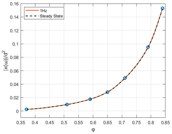 The effect of porosity on dynamic permeability with is shown in Figure 5 for the amplitude and Figure 6 for the phase angle of . Note that is based on the dimensionless analysis proposed in [22], where is the diameter of the SC beam. In Figure 5, increases significantly with porosity, with its maximum and minimum values differing by nearly tenfold. In addition, the dashed line representing steady-state flow coincides with the solid line for the 1 Hz flow, indicating that the 1 Hz condition closely approximates steady flow. In Figure 6, the phase angle is small, which is consistent with observation of the phase difference between and shown in Figure 4a. The near-zero phase angle shows that the imaginary part of is negligible, indicating that the 1 Hz condition is in the low-frequency regime, i.e., . rises nearly tenfold for porosity increasing from 0.37 to 0.84 with a sharper increase at higher porosities, suggesting enhanced fluid transport capacity.