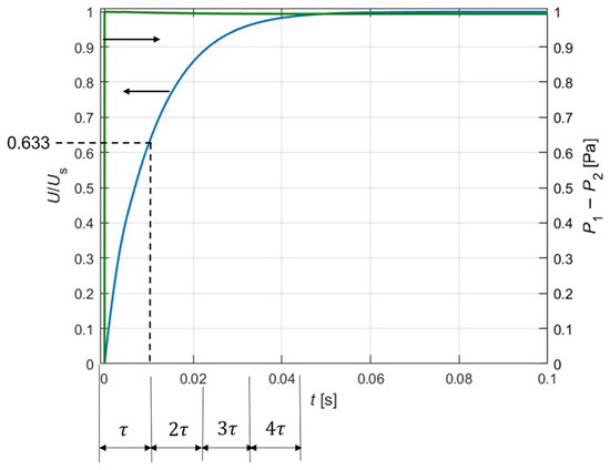 From our previous study [20], we found that the significant difference in velocity field behavior between low and high frequencies, as well as the increasing phase angle of with frequency, is closely related to the relationship between the oscillation time period and the flow system’s step response time constant. Note that fluid flow requires time to fully respond to a change in the pressure field. Therefore, at high frequencies, it is plausible that the flow may not fully respond to the applied pressure gradient before the gradient reverses direction. To estimate the time required for the flow to respond to a pressure field, we considered a step response flow described as follows: