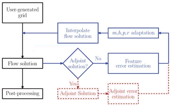 CFD process augmented with an a-posteriori mesh adaptation feedback system. Blue arrows relate to feature-based approaches, red to goal-oriented ones.