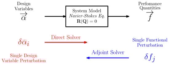 where the adjoint state vector is , f is the quantity to be optimised, such as lift or drag, is the residual vector and is the vector of conservative variables. As Figure 2 shows, the overarching philosophy of the adjoint method is visible. Instead of perturbing a design variable, , and observing how this propagates through the system (via the NS relations) in forward mode to affect a functionalf, the method works in reverse. This means that it perturbs f to determine which changes in would influence it most. In general, there are more design parameters, , than there are performance quantities f; therefore the adjoint approach allows for a reduction in computations. As will be seen later, this extra computation can provide an indication as to where solution imbalances are most influential on the functional level; therefore, it specifies which regions of the mesh ought to be modified.