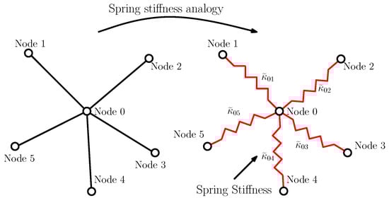 As described by [33], an alternative approach to equidistribution to derive mesh equations is that employing error direct minimisation. By formulating the minimisation in terms of node locations and pde variables, an extra equation may be solved simultaneously with those of the problem at hand. This adds a further unknown to the overall system, i.e., the node position. This technique is generally known as the Moving FEM. One of the most successful mesh movement methods employs a spring-stiffness approach (Figure 4). In this case, the grid edge lengths are the spring-stiffness, while the error can be seen as the potential energy at each node [34]: