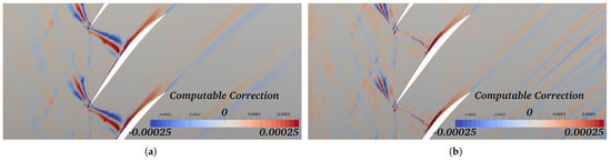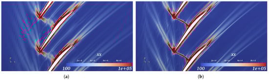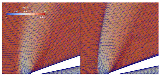 An example of the calculation of the Hessian of the Mach number at the mid-span of a compressor blade before and after adaptation is shown in Figure 11: clearly, the adaptation has sharpened the sensor where the flow features are (shock, its interaction with the boundary layer and shear layers). One of the main issues regarding these techniques was the inability to handle complexities of different magnitudes [11,15,63]. From a physical standpoint, there is no single flow quantity that has a significant variation over all possible features appearing. For example, in a turbulent transonic flow, the Mach number is able to capture the shock, wake and boundary layer, but is uniformly zero at the wall. Therefore, it would miss, for example, the shock propagation at the wall, unlike the static pressure. On the other hand, this quantity does not vary across any wake, separation and boundary layer present in the solution. To this end, refs. [11,15] suggest using multiple flow parameters with non-dimensionalisation of each indicator. In particular [63], merges multiple flow quantities into a single mesh metric with a local rather than global approach, while [58] utilises the static pressure and Mach number to capture all flow quantities. A similar approach is taken by [59,60], where shocks and wakes are extracted separately by employing a combination of velocity, density, Mach number and static pressure. The solution to this particular problem was provided by [64]: the authors developed the metric definition, such that multiscale phenomena (e.g., turbulence and shock/boundary interaction) could be captured via a unique error sensor.