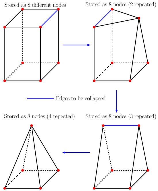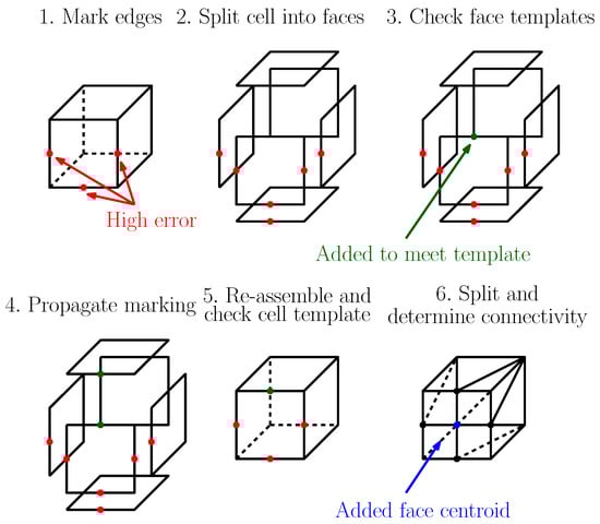 Again employing tetrahedral grids, ref. [38] studied the refinement effect on the resulting element’s quality and showed that, regardless of the number of adaptation steps, a limited set of similar tetrahedra can be created.