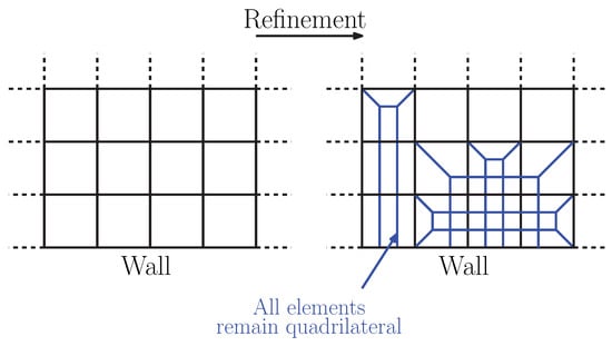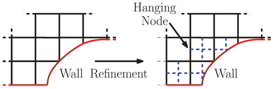 The effect of over-refinement due to the error directionality not being parallel to the cell faces was discussed by [49]. In this case, the refinement templates were defined by their edges, but the constraints on the possible combinations were governed by the faces; e.g., in their case, they allowed a quadrilateral to have all 4, 2 parallel or 2 adjacent (i.e., sharing a node) and a single edge to be marked, but not 3, and in this case, the fourth would be forced to be split, propagating the refinement. Again, as in previous articles, the authors decided to remove any interface element between the refined hexahedral and the coarser mesh regions at the start of the next adaptation step. Another publication of interest is [50]: here, a discussion of the differences between splitting edges of a fully hexahedral mesh into 2 or 3 sub-edges is explored, with particular attention to the parallel implementation of the former. In fact, once the domain has been split, it is difficult to achieve the same refined mesh, regardless of how the parallel division is carried out. Another refinement methodology of interest is that relating to Cartesian meshes: in this case, starting from a fully quadrilateral or hexahedral grid, it is possible to maintain the element type even after adaptation (see Figure 10). This requires a modification of the solver to be able to handle hanging nodes. Successful examples of Cartesian mesh adaptation are [51,52,53]. An important advantage of these methods relates to their speed. p-methods are sometimes called order enrichment, and they consist of the increase or reduction in the polynomial order in the flow solver. From an intuitive point of view, it is a “flow solver refinement” process, as no change is applied to the physical grid. These techniques are generally applicable to high-order methods (in general high-order methods have an order greater than 2, i.e., that of standard FVM approaches). These methods include FEM or related methods (e.g., Spectral Elements). For this reason, according to [11], in the past, they have found limited use in CFD since, in general, higher-order solvers involve greater complications in terms of monotonicity near discontinuities and in turbulent flow (examples as to how these have been solved can be found in [54] for incompressible flows and [55] for compressible ones). Additionally, the author states that they are more difficult to code since there are more possible templates for each type of cell. Nevertheless, in more recent years, much of the flow solver-related research has been carried out with high-order methods, meaning that p-adaptation techniques have started to gain more and more momentum. Examples of the use of order enrichment can be found in [6,14].