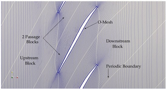 A particular area that has received a significant amount of interest over the recent decade is mesh adaptation for turbomachinery. The first tests were carried out by [71], who adapted a hybrid prismatic-tetrahedral mesh for a viscous NASA Rotor 37 simulation, run with the turbulence model. They employed the relative Mach number as their sensor to form the Hessian matrix. A combination of movement, edge collapse, swap and split was used to adapt the grid. Despite improving the clustering towards the main features of the flow, the results were not completely satisfactory. More recently, ref. [82] considered the LS89 turbine blade in 2D and NASA Rotor 37 in 3D and regenerated the mesh for both cases. In particular, in the latter case, the authors employed prismatic elements in the boundary layer, that were left untouched by the adaptation. The rest of the domain was filled up with tetrahedral cells, that were actually regenerated employing a Riemannian-metric. Of note, is also the fact that they did not modify the periodic boundary of the starting mesh, that had a node count of 2.8 M. The resulting adapted meshes show how the main flow features are captured, however, there is no indication of how the final grid performs in terms of quantities of interest (such as efficiency or pressure ratio). Regarding the periodic boundary, in [94], the same research group demonstrated the necessary upgrades to be able to handle periodic boundary mesh re-generation for gas turbine components using fully tetrahedral meshes without hexahedral/prismatic elements. Another application of feature-based adaptation applied to jet engines is presented in [95]: here they considered flow separation in a nacelle under cross-wind conditions using isotropic and anisotropic adaptation with two different solvers tuned to the different approaches. An important consideration the authors make is that within the turbomachinery community, mesh adaptation has found limited use due to the heavy use of structured multi-block meshes (Figure 12) that allow good resolution of boundary layers and wakes. This particular industry has now gained a significant experience with these methods. The authors argue, however, that other strategies are needed to be able to handle the increase in complexity. Their results show that both grid modification strategies provide accurate predictions starting from coarse meshes, however, the anisotropic counterpart achieves similar accuracy at size of the isotropic counterpart. Another key statement from this publication is that mesh adaptation is more expensive than 1 shot simulation. A very interesting turbomachinery problem was first considered in [96,97], i.e., a film-cooled nozzle guide vane. The authors employed feature-based Mach number interpolation error in the , and despite the complexity of the case, they achieved flow solver and mesh convergence to obtain a certifiable numerical solution. The ability to apply the same adaptation strategy to another challenging gas turbine configuration was recently seen in [98], where multistage and mixing planes were employed in the modelling. Still regarding this application area, ref. [99] utilised Hessian-based mesh movement in a geometrical optimisation loop of the NASA Rotor 37 test-case.