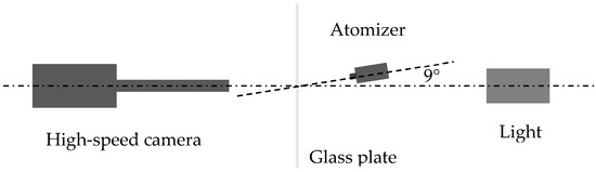 Visualization of droplet impact events on a glass plate using an industrial air atomizer was carried out with the setup shown in Figure 2. An air spray gun (SATA LPS RB 2000RP, SATA, Kornwestheim, Germany) and a solvent basecoat were applied. In the first step, a wet paint layer with a well-defined thickness was applied on the glass plate. Subsequently, the resulting droplet impact processes on the wet layer were recorded by the high-speed camera. Snapshots with an image size of approx. 1.8 mm × 1.8 mm and a 1024 × 1024 pixel resolution were analyzed. In general, many air bubbles could be observed in the paint layer. In Section 5, these visualization results will be compared to the simulation results.