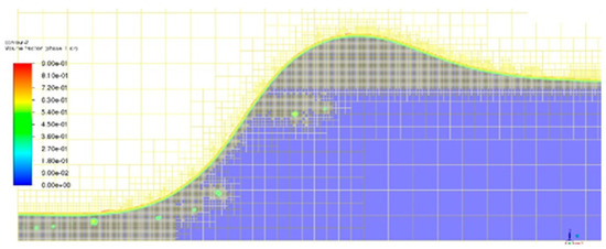 A thin film with a height between 30 and 60 µm and an infinitive width was applied on the substrate. As a first step, droplet impact processes were calculated using a two-dimensional axisymmetric geometry to obtain a general insight into the behavior of the gas–liquid interface as a function of relevant dimensionless numbers, namely, Re-, Oh-, and We-numbers. As a second step, the computational domain of 8D × 8D × 3D was created for more detailed simulations of the impact of droplets that contain a flake. Clearly, the number of computational cells increased tremendously. Local grid adaption and dynamic mesh adaption were carefully performed, ensuring the necessary grid resolution. Especially in case of large droplets, e.g., 300 µm, the inhomogeneous grid region enlarged significantly due to the necessary inclusion of the crown formation and wavy structures around the impact location. A typical mesh model based on dynamic adaptation is shown in Figure 5. In this case, the mesh size around the interface between liquid and gas is set to 1 µm, while being 16 µm at a larger distance from the interface.