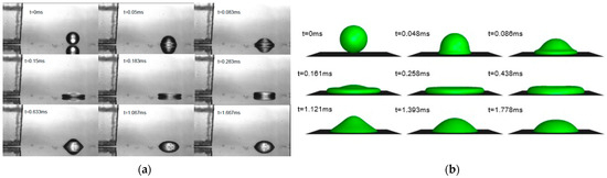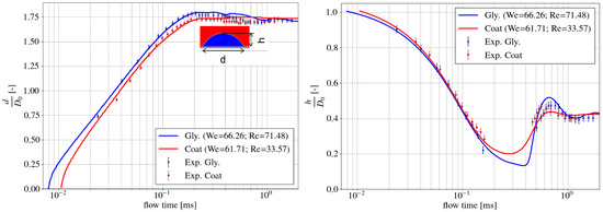 Validations of the numerical models for the impact process of viscous droplets on a dry solid surface were carried out using the single droplet generator and the visualization technique, as described in Figure 1a. Glycerol/water droplets (D = 400 µm, η = 20 mPa·s, σ = 0.063 N/m, = 55°) and model paint droplets (D = 300 µm, η = 17 mPa·s at γ = 105 (1/s), σ = 0.025 N/m, = 53°) were created. Simulations were performed using the two-dimensional axisymmetric domain. Figure 7 shows the comparison between the high-speed-camera recording and the simulation of a glycerol/water droplet impact. The obtained videos of the impact processes for both droplets were further analyzed with respect to the evolution of the droplet spread factors d/D0 and the height ratios h/D0. In the simulations, advancing angles of 120° for glycerol/water droplets and 95° for paint droplets were used, estimated from the high-speed videos. In Figure 8, experimental and simulative spread factors are compared. Quite good agreement can be observed, which indicates that the proposed dynamic contact angle model delivers a good performance and is suitable for more advanced applications.