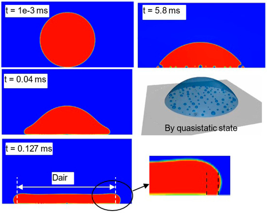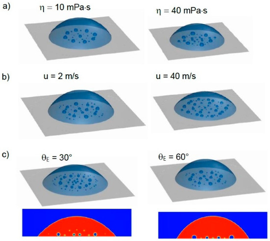 Figure 9 shows simulation results of the droplet contour evolution during the impact process of a 300 µm droplet at an impact velocity of 4 m/s on a dry surface. A thin layer of air bubbles (further also called an air disc) is formed directly at the contact area between droplet and substrate. This air disc is continuously enlarging during the drop spreading until a fully wetted contact line is created and the maximum air disc diameter is observed, which is smaller than the maximum droplet spreading diameter, as shown in Figure 8 at t = 0.127 ms. The air disc then contracts into larger bubbles during the receding process, in which some bubbles can also be released, as shown in the figure at t = 5.8 ms. At the quasi-static state, there are still large air bubbles on the substrate, as the release of the remaining bubbles slows further in the quasi-static state. The total amount of remaining air bubbles in a quasi-static state depends on the properties of the liquid and substrate, as well as the operating conditions. For a water droplet with an identical size and impact conditions, the maximum extension of the air disc and the final number of bubbles on the substrate in the quasi-static state are significantly reduced [12]. Some influence factors on the air bubble formation are indicated by Figure 10, where the quasi-static state of the impact of a viscous 50 µm droplet is analyzed. More bubbles are observed in the case of a higher viscosity (Figure 10a). In addition, a higher impact velocity leads to a larger air disc during the spreading process and ultimately to more bubbles (Figure 10b). With a smaller equilibrium contact angle = 30°, i.e., improved wettability, bubbles tend to reduce their wall contact area, leading to larger distances between the bubble centers and the wall (Figure 10c). This should also ease any additional bubble release in a quasi-static state. Since Figure 10 was created based on the quarter of the spherical droplet with a symmetric boundary, the results shown only demonstrate the dependency between the air entrapment and the different operating conditions, but not the exact distribution of air bubbles inside a droplet.